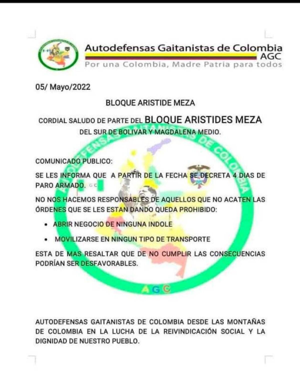 En un panfleto, firmado por las “Autodefensas Gaitanistas de Colombia”, como se hacen llamar, el grupo ilegal prohibió a la población abrir negocios comerciales y movilizarse en cualquier medio de transporte durante los próximos cuatro días.