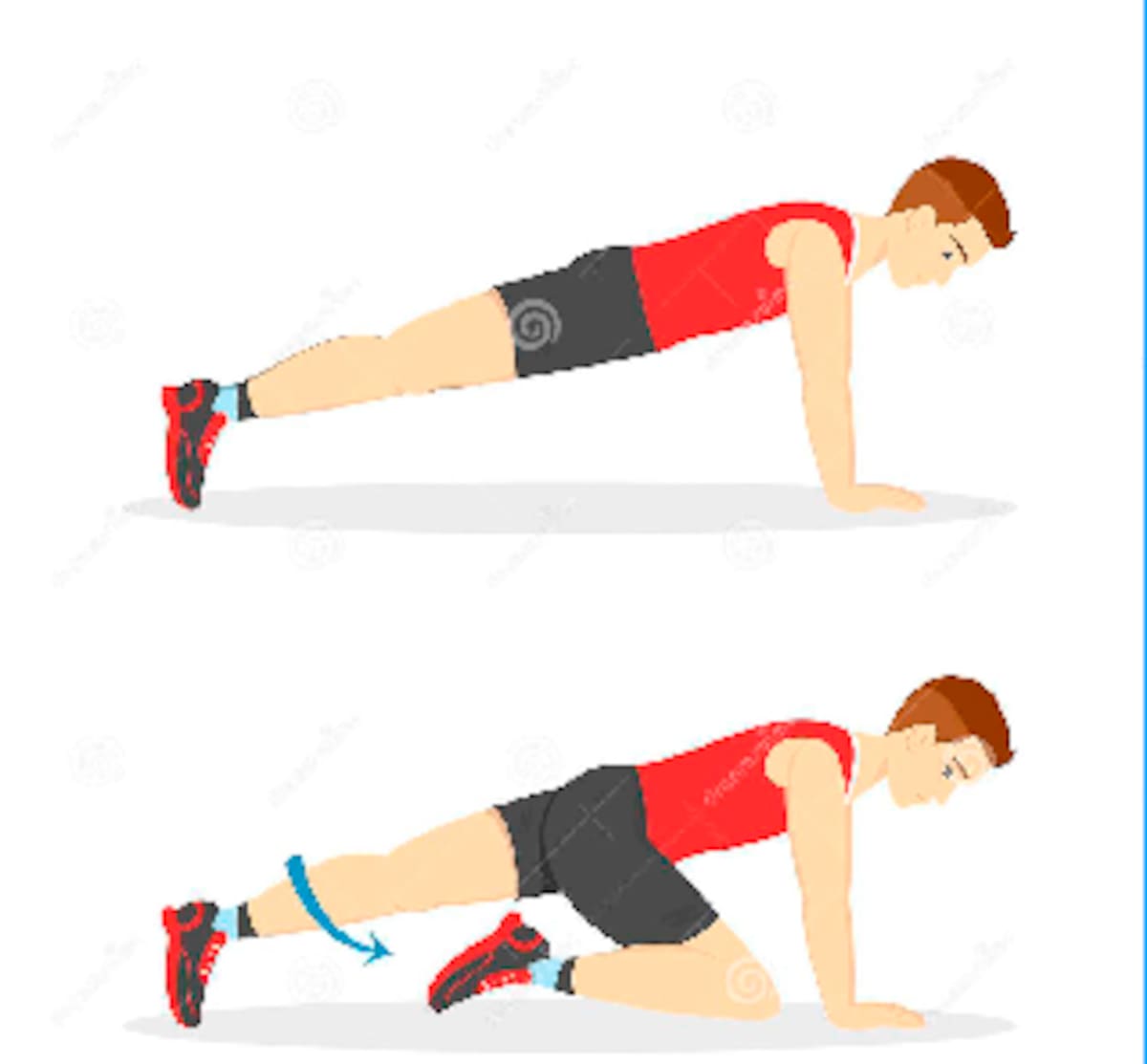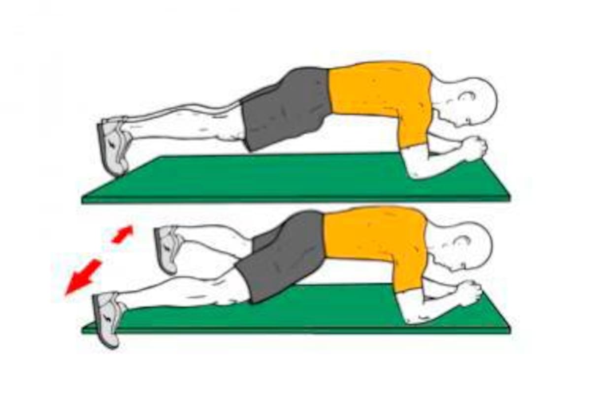Posición de plancha. Levanta uno de los pies un poco y comienza a doblar la rodilla mientras la mueves hacia tu rostro, entre tu cuerpo y el suelo. Y repite el movimiento con la otra pierna.