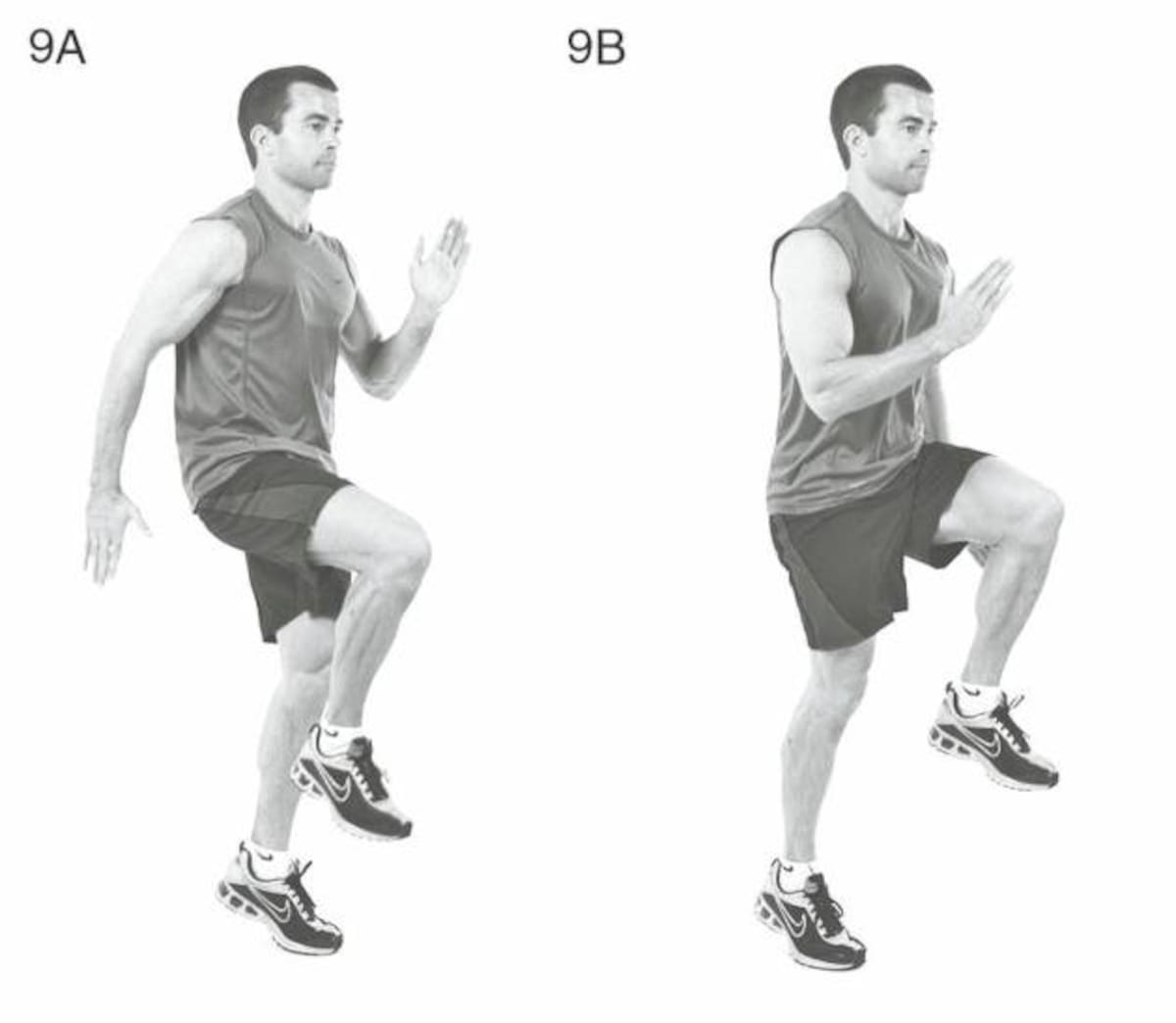 Se utiliza mucho en la activación, como ejercicio para el tren inferior elevaciones de las rodillas y los puños de frente para llegar a una mayor intensidad. En este caso los puños van de frente.