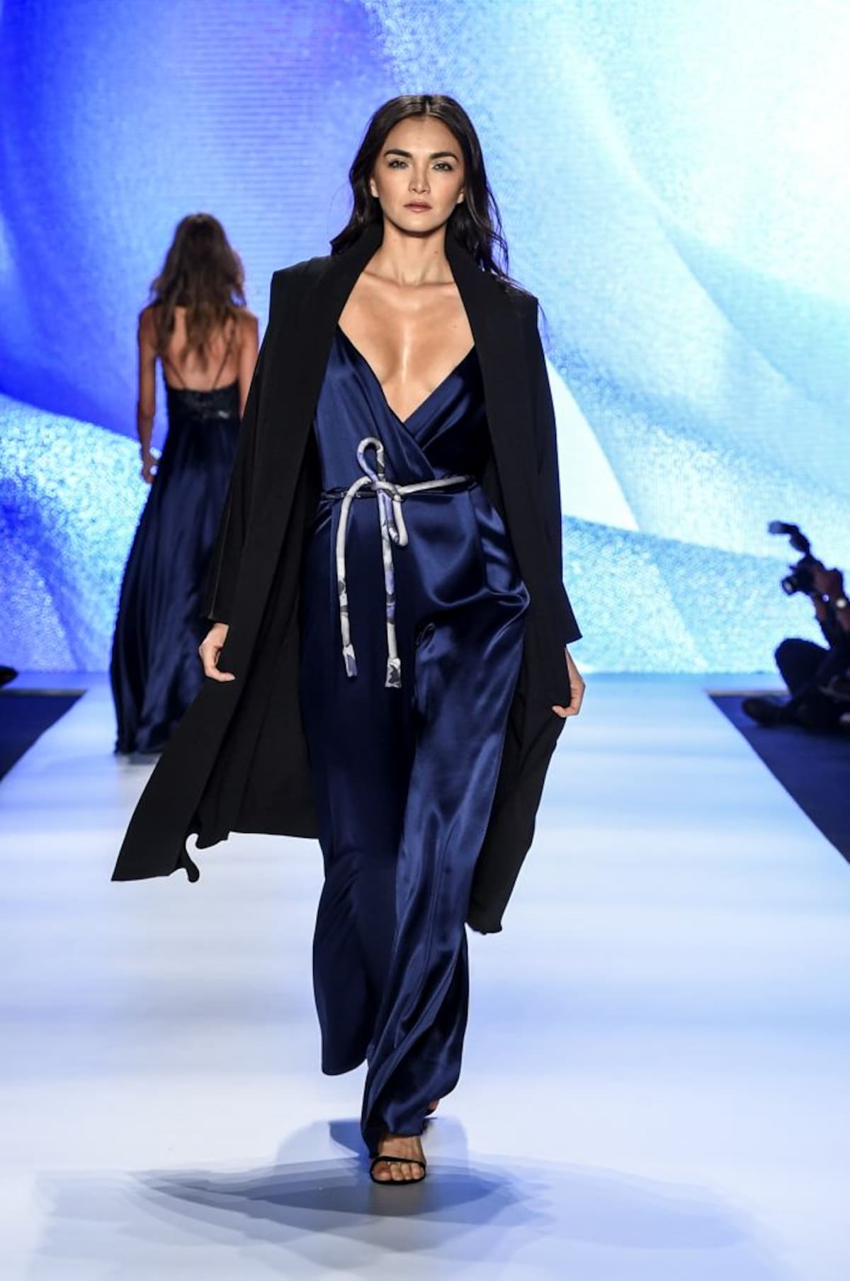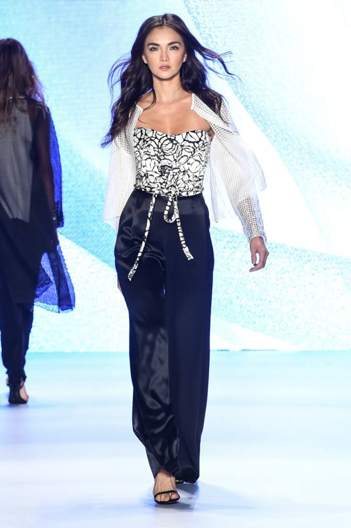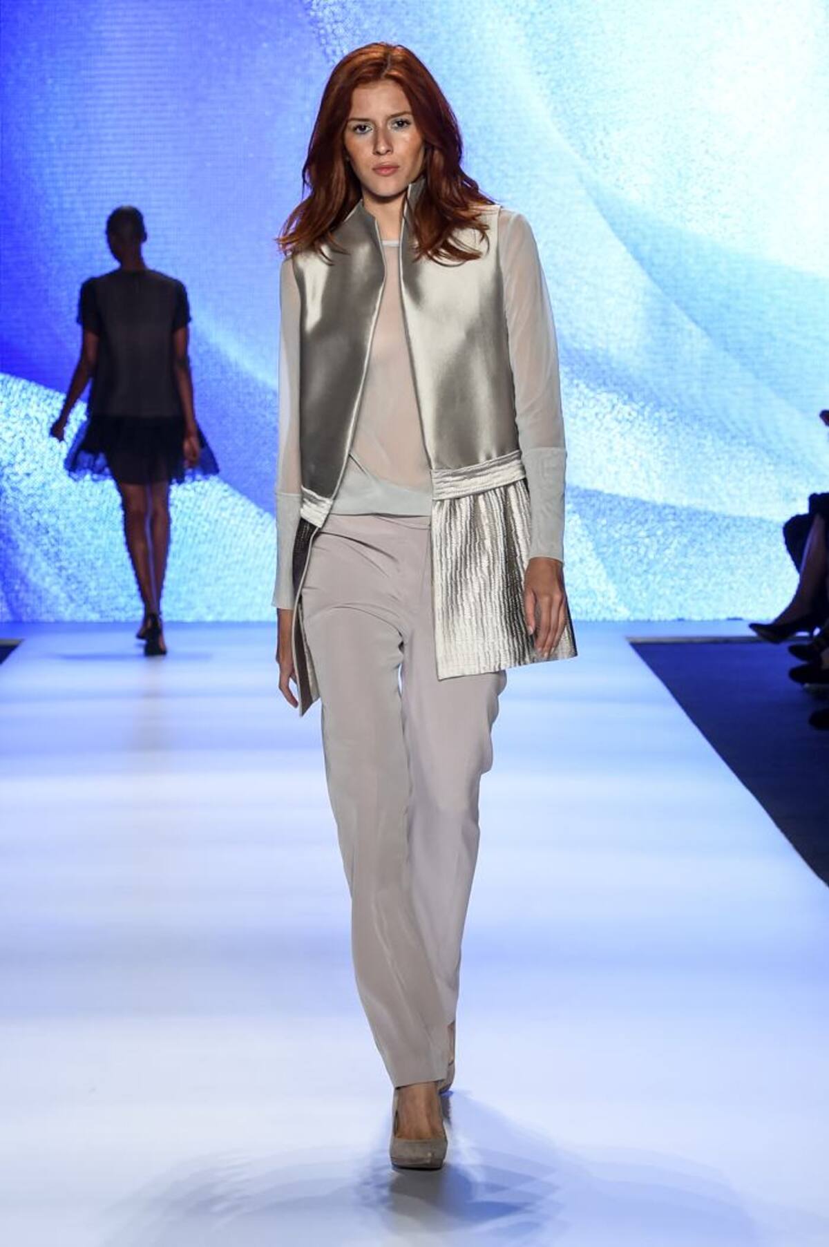 Esta joven diseñadora, que tiene entre sus clientes a la esposa del presidente, María Clemencia de Santos, trabajó pantalones amplios sin exagerar, faldas estilo tulipán, vestidos largos acompañados por capas sueltas y enterizos.