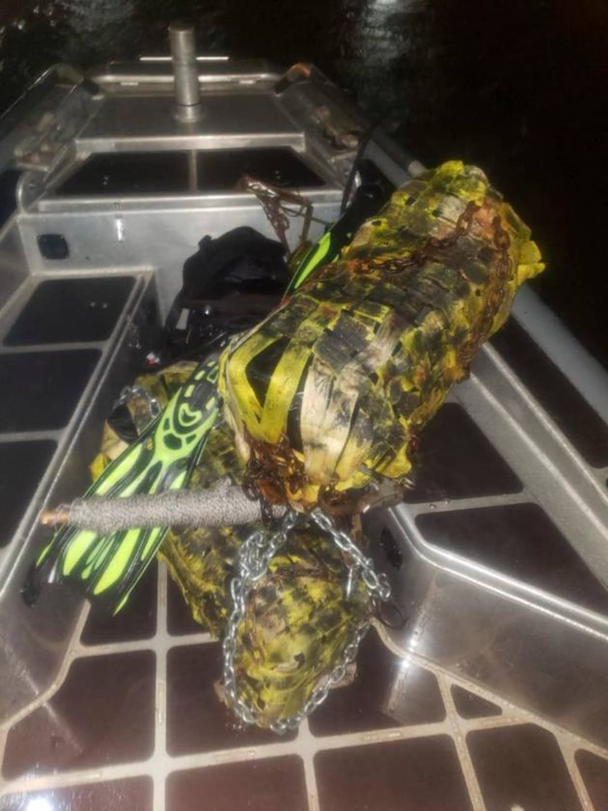 Los buzos, dice el reporte oficial, intentaron huir por tierra, escondiéndose en una zona boscosa y dejando abandonadas dos tulas con 90 paquetes rectangulares de presunta sustancia ilícita y los equipos de buceo autónomos para respiración subacuática. En total, fueron 90 kilos de cocaína los decomisados.