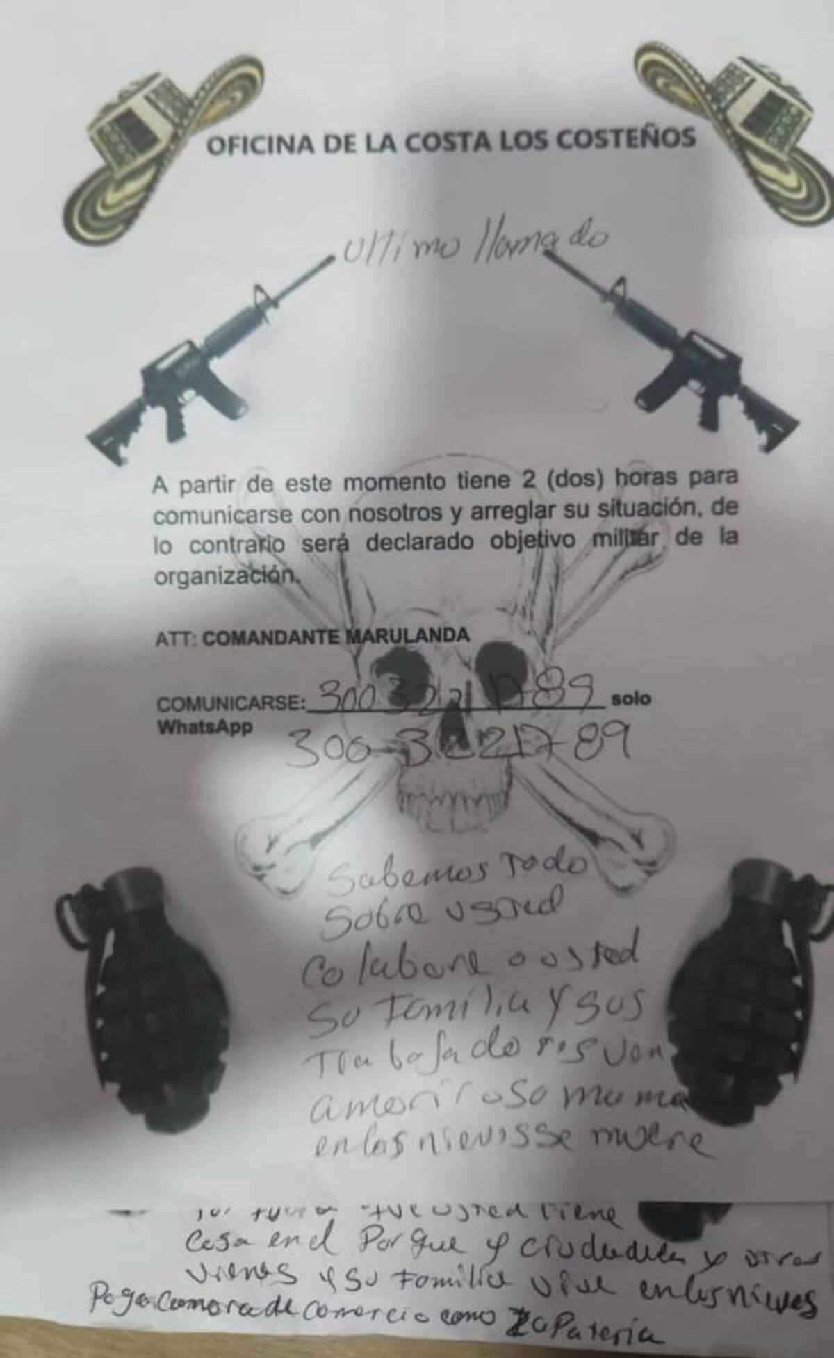 Manifestó que con disparos contra la fachada de la residencia de la víctima buscaban intimidarla, los cuales quedaron registrados en cámaras de seguridad; también quedó registrada la forma en que repartían los panfletos extorsivos a bordo de un vehículo tipo taxi para pasar desapercibidos. “Todos estos elementos hicieron parte del material que sirvió como insumo para seguirle los pasos a estos delincuentes, los cuales identificaban como: ‘La oficina de la Costa’, ‘Los costeños’ y ‘comandante Marulanda’”.