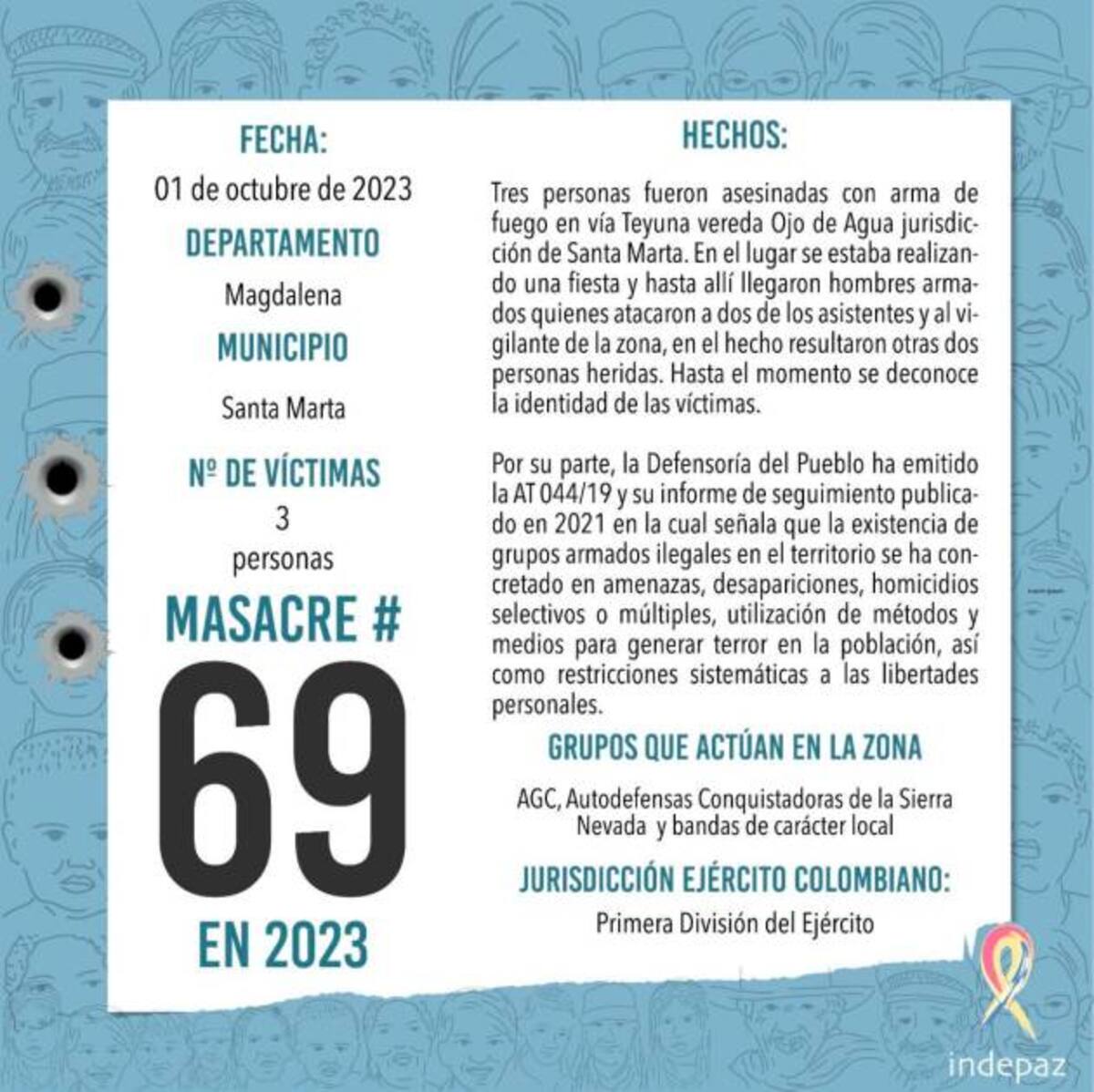 El Instituto de estudios para el desarrollo y la paz (Indepaz) confirmó que el asesinato del vigilante del lugar y dos asistentes a la fiesta es la número 69 que ocurre en Colombia, en lo que va de este año.