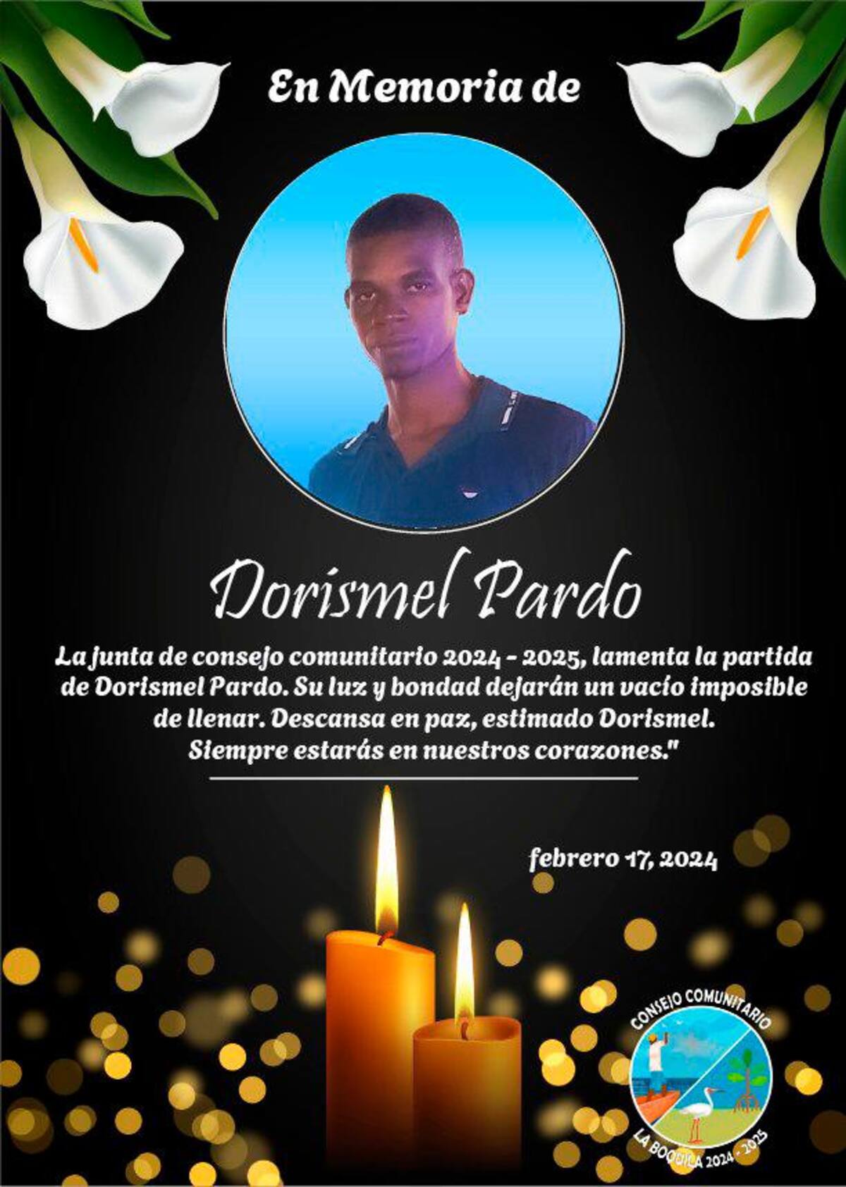 “Estimada familia de Dorismel Pardo. Nuestras más sinceras condolencias por la pérdida de Dorismel. Que el amor y los recuerdos compartidos les brinden consuelo en estos momentos difíciles. Que su legado perdure en nuestros recuerdos y que podamos honrar su memoria siendo una comunidad unida y solidaria. Dios lo tenga en su santo reino..!!