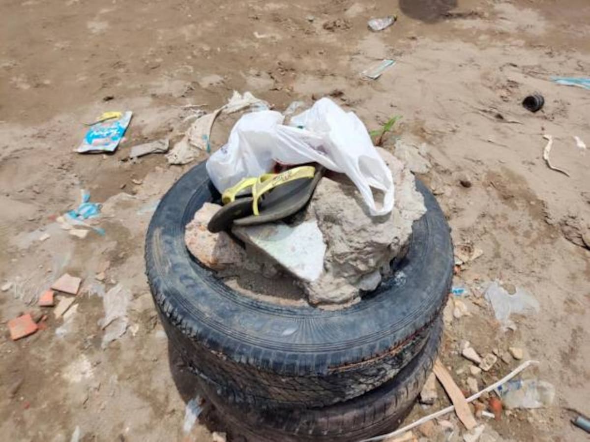 En una piedra que está sobre unas llantas frente al callejón de Las Esteras, sector Bajo Manhattan del Barrio Sur, quedaron sus chancletas y dentro de una bolsa blanca otras pertenencias.