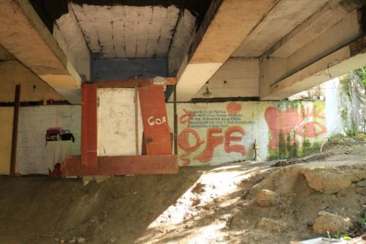 “El señor es mi pastor, nada me faltara. Verdes pradera me ase descansar, alas aguas tranquilas me conduse y me da nueva fuersa. Me yeva por kamino recto”, leo en una de las bases del puente. Aquí hay cuatro espacios separados por madera o láminas de zinc que funcionan como cuartos y en ellos habitan nueve familias compuestas por diez adultos y 17 menores, el más pequeño es un bebé de tres meses. En la mitad de esta “vecindad” está el arroyo, han dispuesto cuatro piedras grandes para atravesarlo.