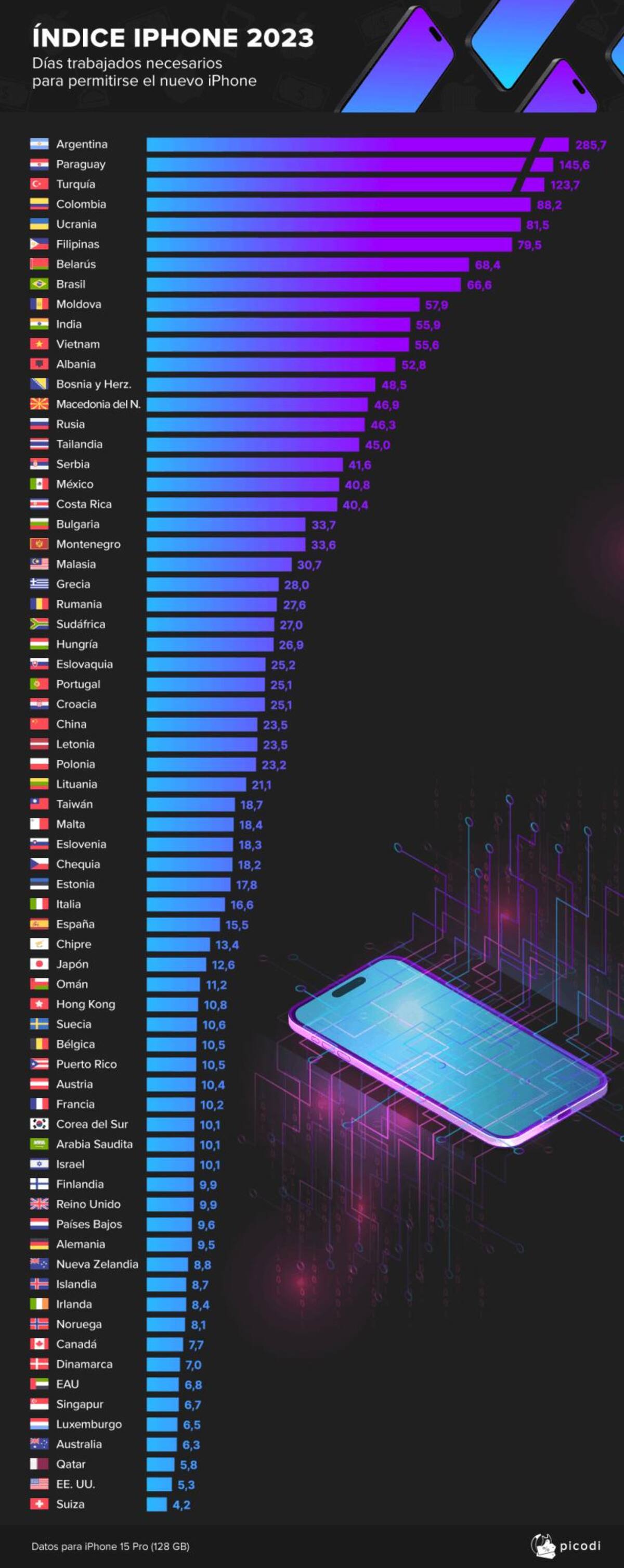 De los países incluidos en el ranking, el peor resultado corresponde a Argentina, donde el valor de un nuevo iPhone equivale a 285,7 días laborables. Las siguientes posiciones en la lista de los peores resultados las ocupan Paraguay y Turquía, con 145,6 y 123,7 días respectivamente.